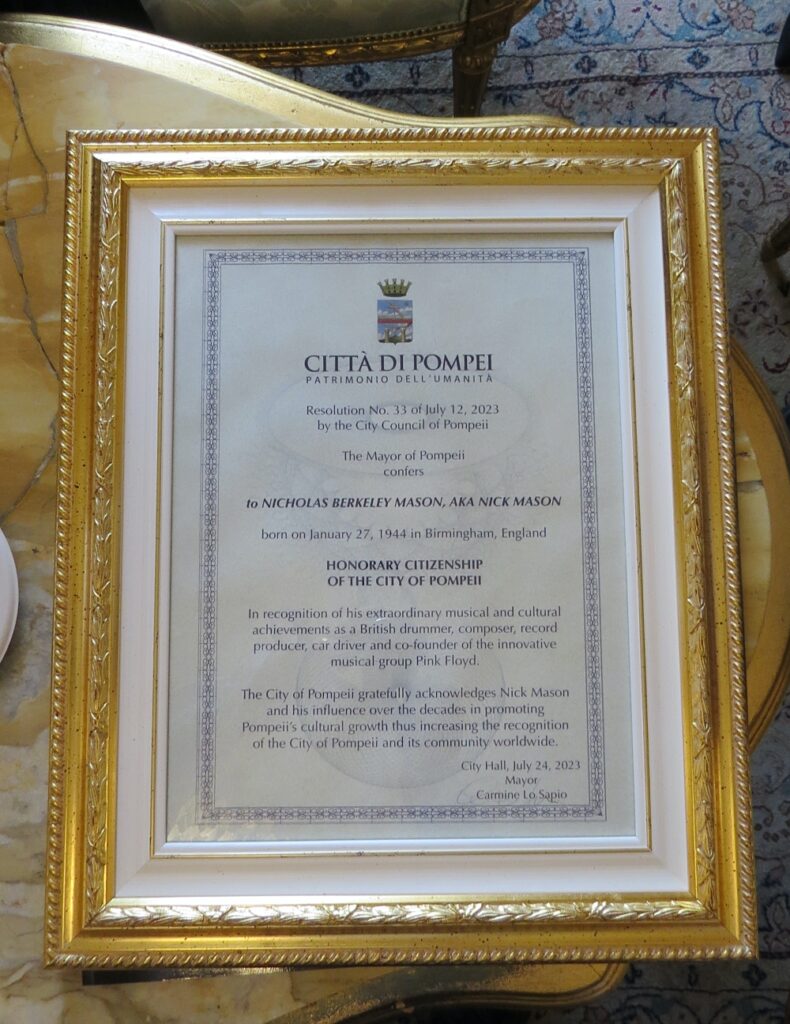 Gister middag heeft de stad Pompeii Nick Mason de titel van ereburger toegekend. In zijn dankwoord bedankte Nick Mason zijn collega’s Roger Waters, David Gilmour en Richard Wright. De Facebook-pagina van Mason bevat foto’s van de benoeming: de stad Pompei in Italië verleende de titel van ereburger aan Nick Mason.